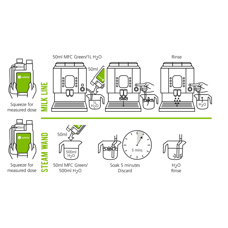 The Cafetto MFC Green Milk Frother Cleaning Liquid is a high-performance, organic cleaning solution formulated to remove milk residues and descale automatic milk systems. Derived from natural acids and certified by NSF, this biodegradable concentrate ensures powerful cleaning without leaving any harmful residues or odours.